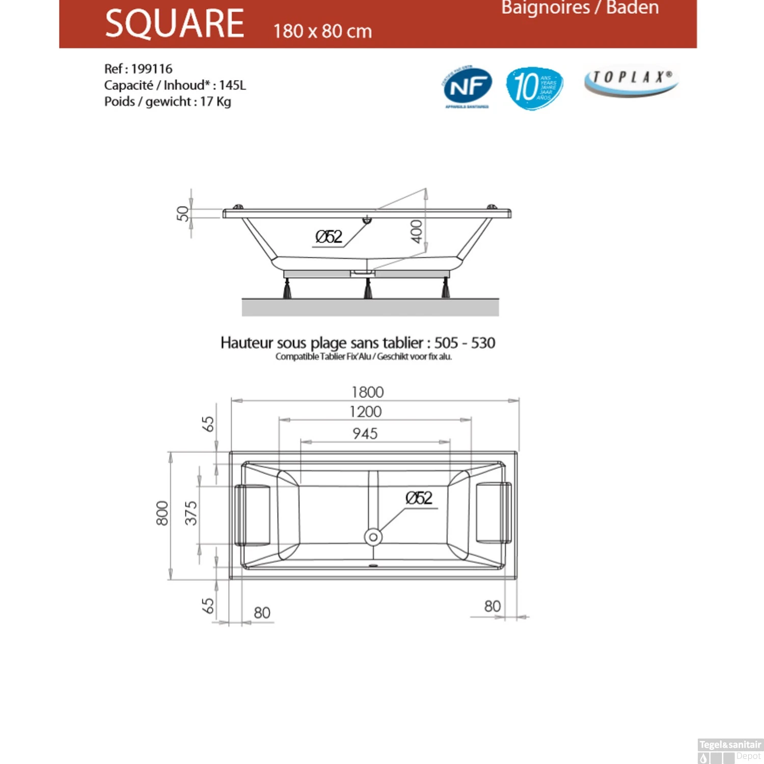 Specificaties Allibert SQUARE Rechthoekig Ligbad 180x80x50,5-53,5 Wit: