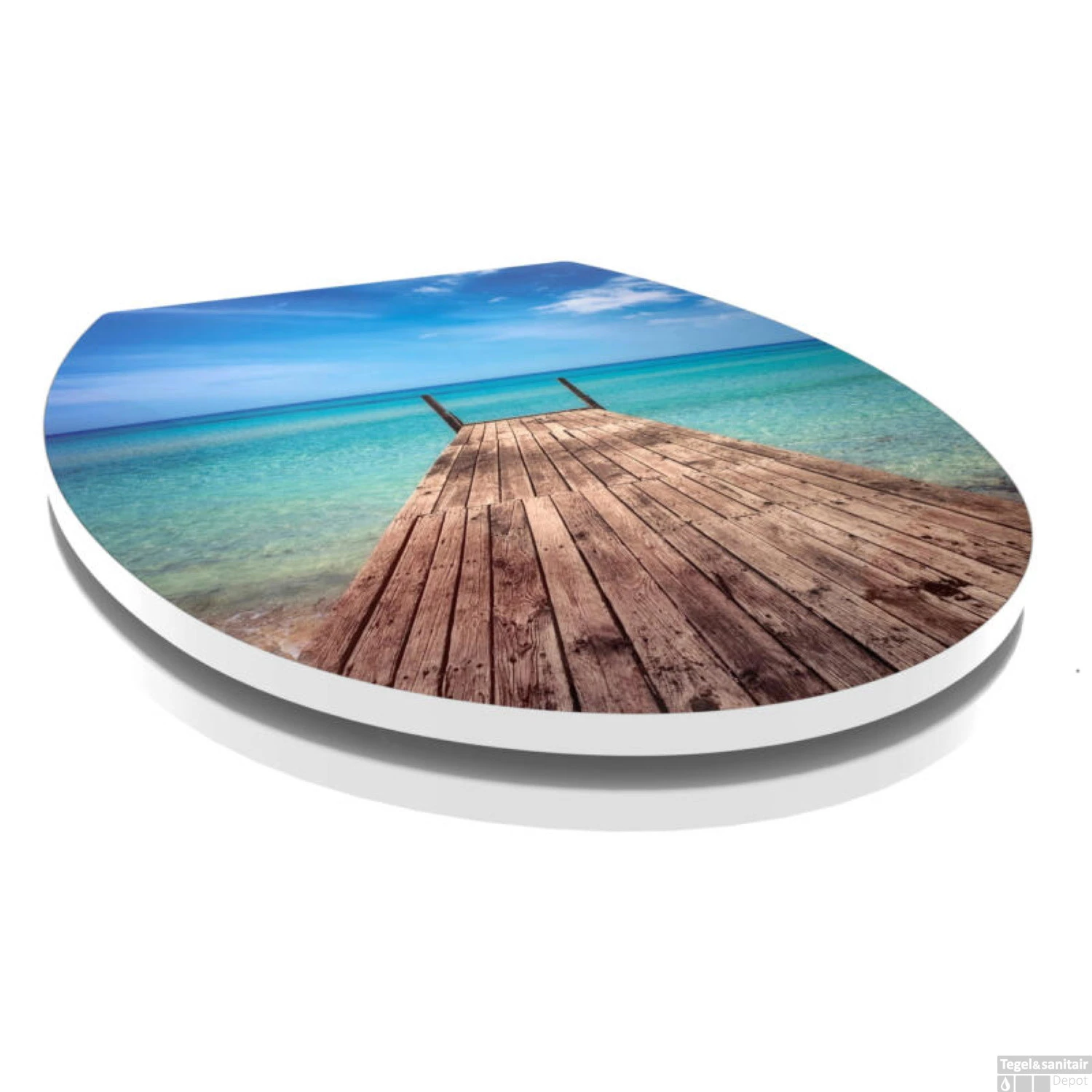 De Noumea is een toiletzitting van het bekende merk Allibert. De zitting heeft een vrolijke look. Omdat het een plaatje heeft wat je het gevoel van vakantie geeft met het fraaie blauwe water. De zitting heeft twee RVS scharnieren die gebruik maken van het soft close systeem. Soft close is dat de zitting rustig en zacht sluit. De zitting zelf is gemaakt van het materiaal duroplast. Het heeft een breedte van 38 cm, de lengte is 43,5 cm en de dikte is 6 cm.