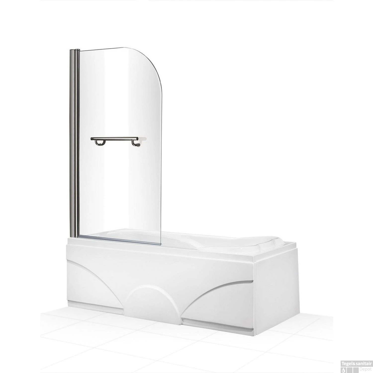 De afgeronde douchewand is gemaakt van 6mm dik veiligheidsglas. Met veiligheidsglas wordt bedoelt dat op het moment dat het glas onder druk komt te staan en knapt, dat er geen scherpe scherven ontstaan. Het glas breekt namelijk direct in honderden vierkante stukjes. Het blijft natuurlijk glas, maar kleine stukjes zijn minder gevaarlijk dan scherpe scherven. Verder is de wand voorzien van een lange elegante handgreep en om het water in uw badkuip te houden zit er aan de onderkant van de badwand een strip. Dit beweegt mee zodra uw de badwand laat scharnieren. De wand is zowel naar rechts als links te scharnieren.