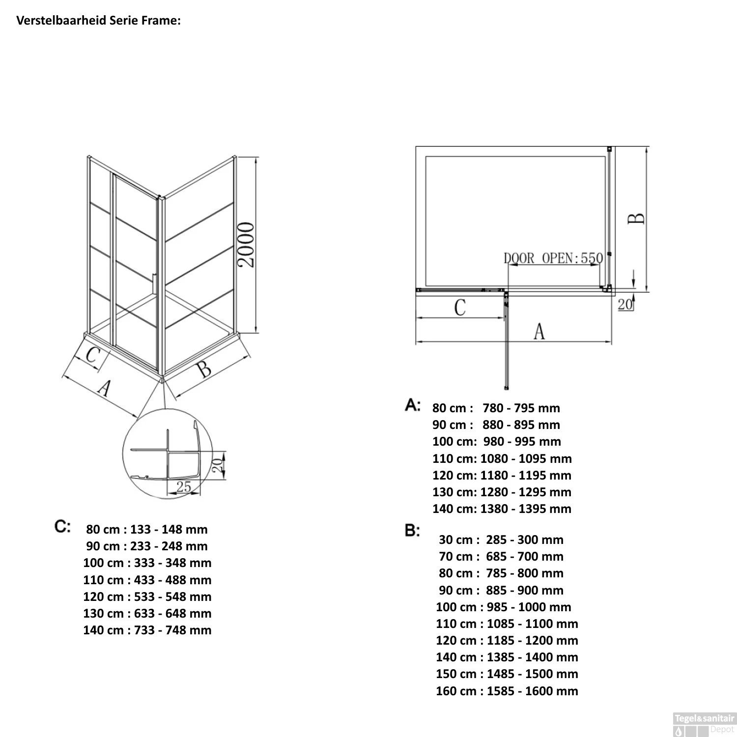 Specificaties BWS Inloopdouche Frame 140×200 cm 8mm NANO Glas Mat Zwart Raster: