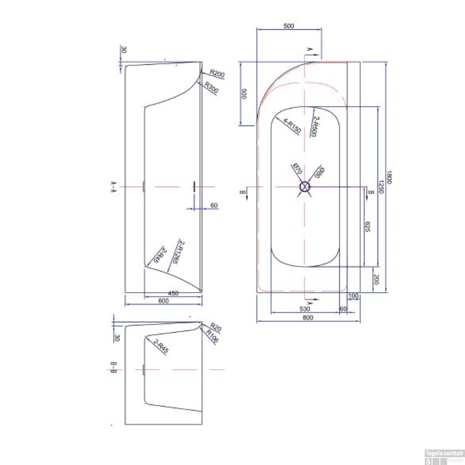 Het half vrijstaande hoekbad is aan de rechterkant recht afgewerkt, terwijl de linkerkant een halfronde vorm heeft. Dit bad is tevens leverbaar in een variant waarbij de rechterkant rond is afgewerkt en de linkerkant recht. Aan de zijkant van het bad bevindt zich een kleine gleuf die dient als overloop. Deze overloop zorgt ervoor dat wanneer het bad te vol begint te lopen het water automatisch via deze gleuf de riolering in loopt. Het bad heeft een lengte van 180 cm, een breedte van 80 cm en een hoogte van 60 cm.