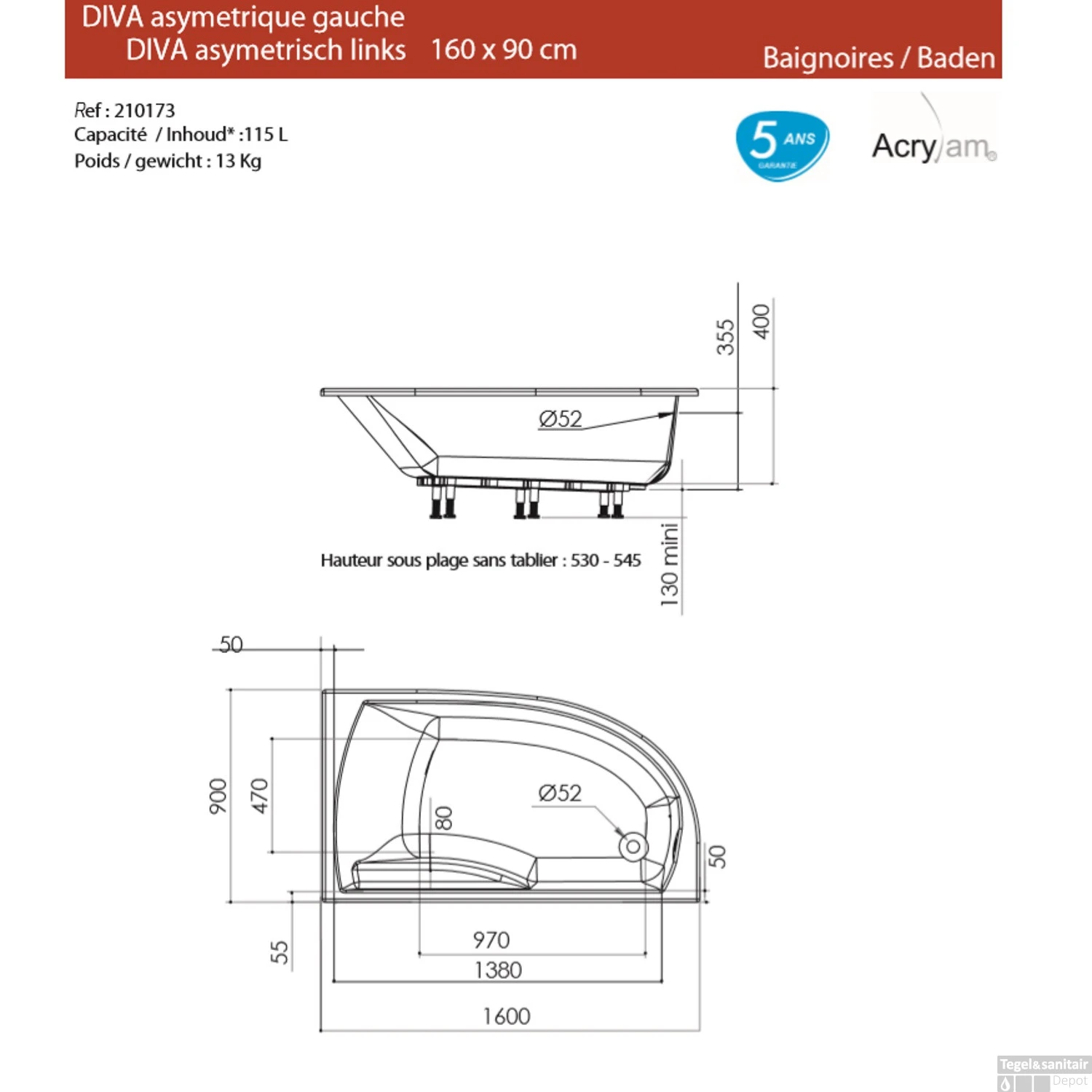 Hoekbad Allibert Diva 160×90 Cm Asymmetrisch Links