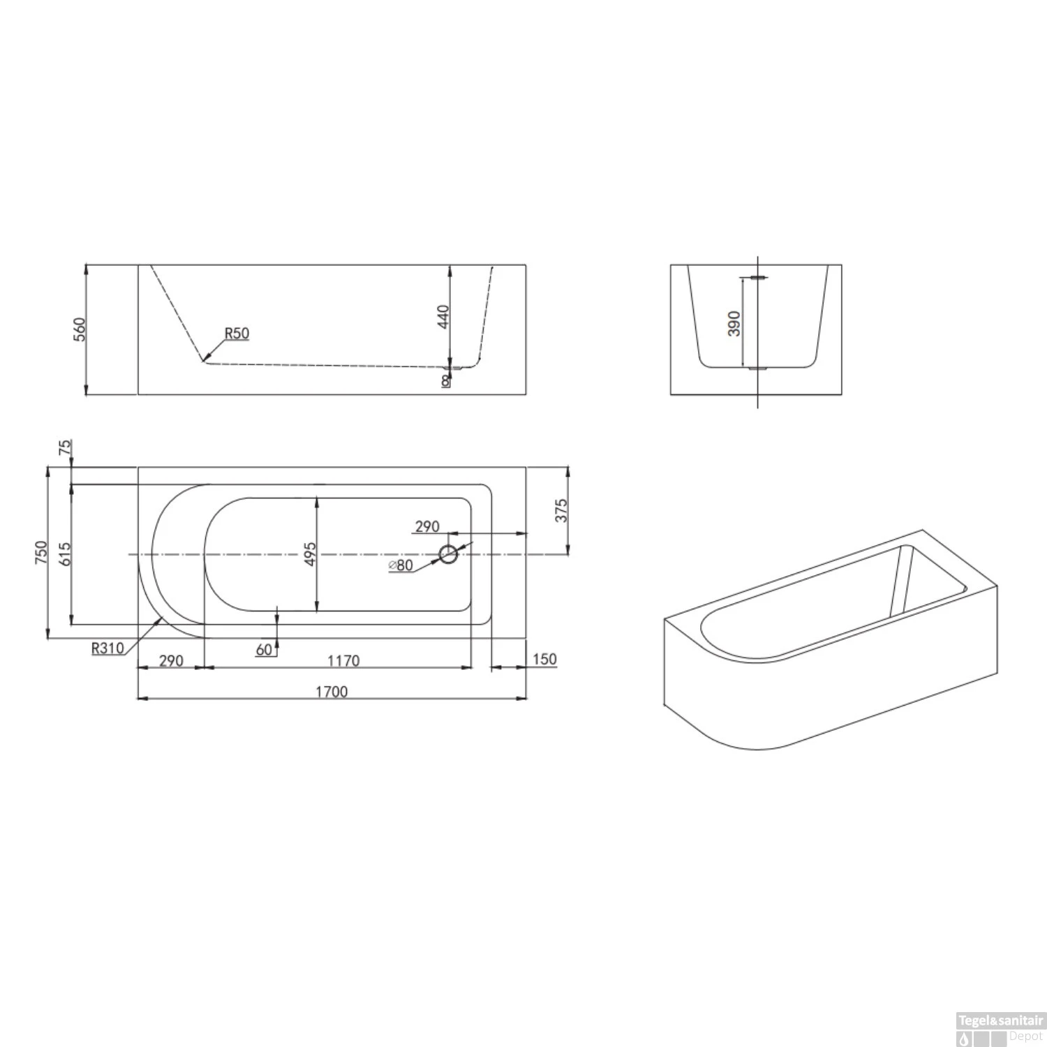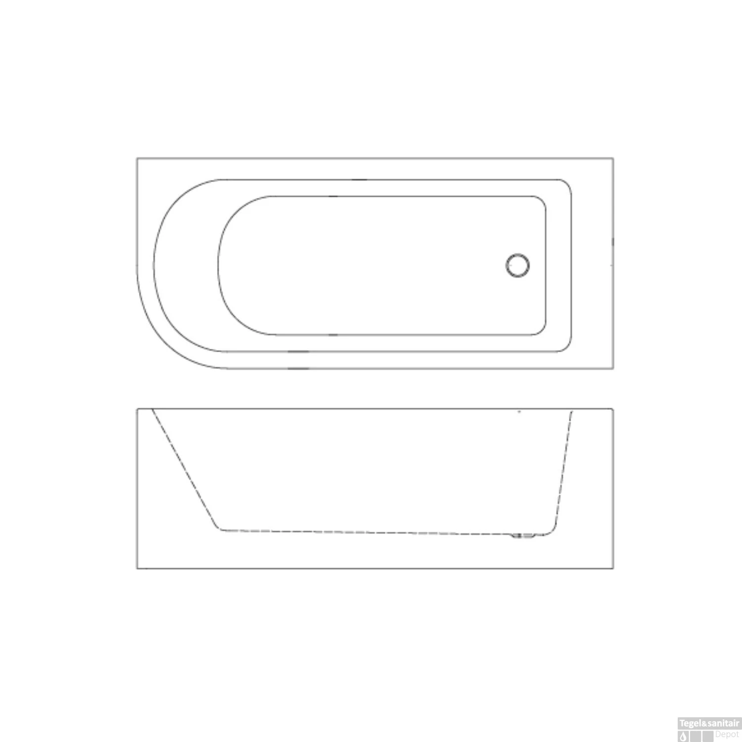 De lengte van dit bad is 170 cm, de breedte is 75 cm en de hoogte is zonder poten 44 cm. Wanneer u de poten onder de badkuip plaatst zal de hoogte van de badkuip naar 56 cm hoog gaan. De inhoud van dit bad is 180 tot 250 Liter water.