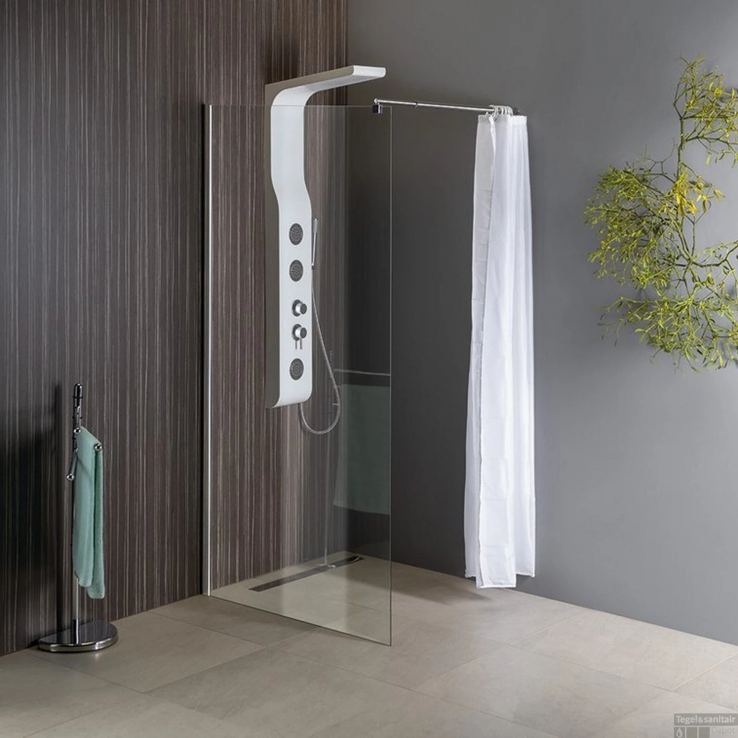 De douchewand heeft geen vloerbevestiging, waardoor u de wand direct na het plaatsen kunt afkitten. De stabilisatiestang wordt meegeleverd en is universeel toepasbaar.
