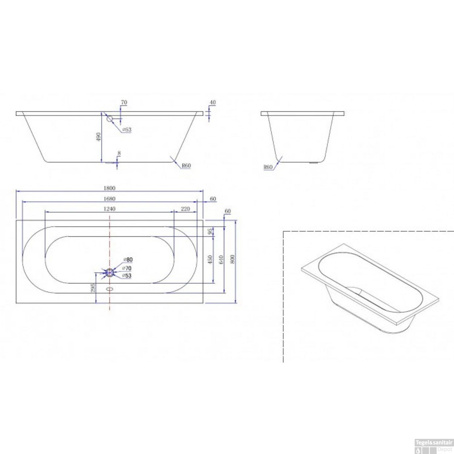 Ligbad Duo Wiesbaden Portus Inbouw 180x80x50 cm WitÂ