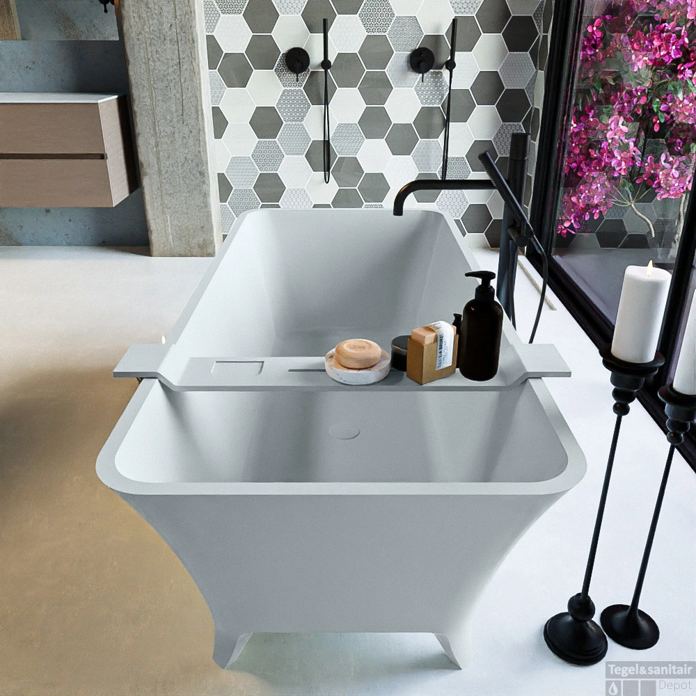 Een bad op pootjes die geweldig staat in elke badkamer. De vorm leent zich voor vrijstaand en half vrijstaand. Deze schitterende opstelling is gecombineerd met het badmeubel VICA zowel de Solid Surface wastafel als het meubel kan in exacte dezelfde kleur als het bad. Zo breng je kleur in je badkamer.
