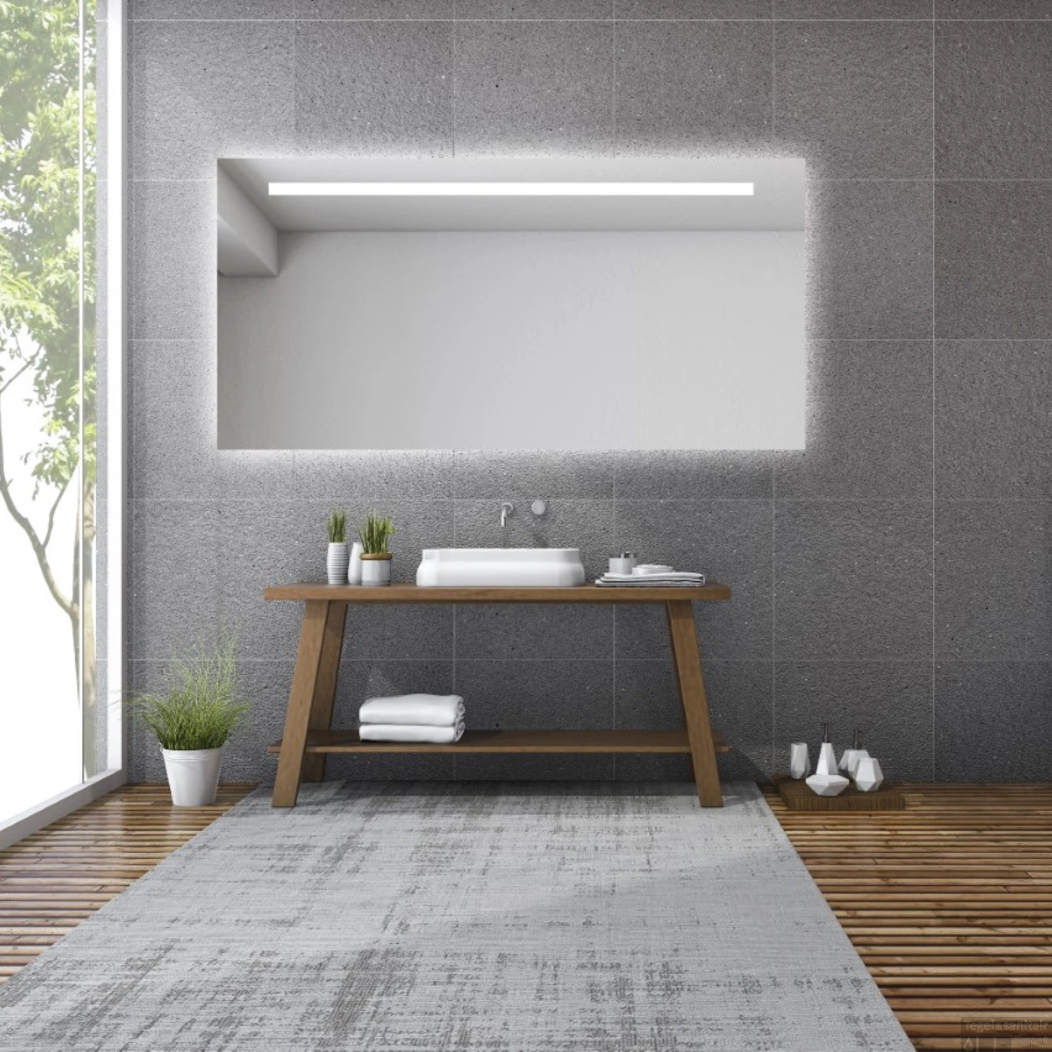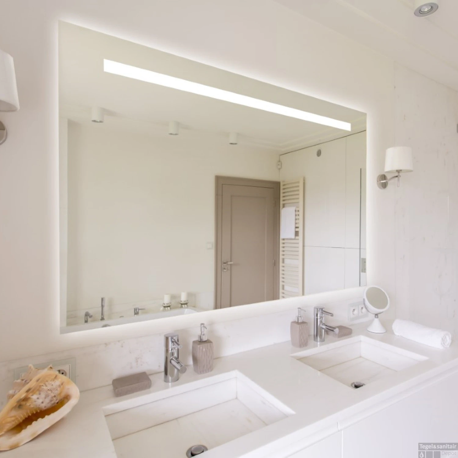 Deze rechthoekige spiegel is van het merk Gliss Design en is een absolute aanwinst voor uw badkamer. De spiegel komt uit de serie Horizontaal Led en het fijne van deze spiegel is dat u extra verlichting in uw badkamer krijgt. De horizontale verlichting bevindt zich aan bovenzijde van de spiegel. Ook aan de achterzijde bevat de spiegel “backlight” verlichting, wat inhoudt dat de verlichting over de rand van de spiegel en op de muur schijnt.