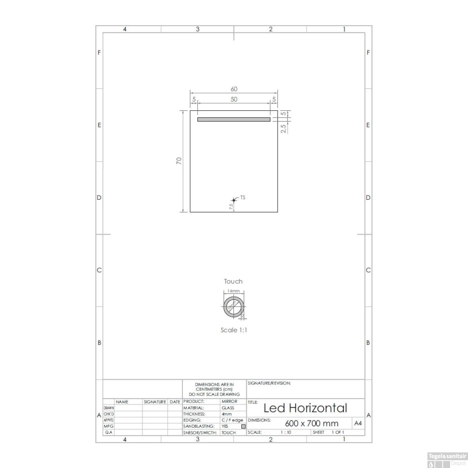 De spiegel is 60 cm breed, heeft een hoogte van 70 cm en een glasdikte van 4 mm. Verder bevat de spiegel een touch knop waarmee u de verlichting eenvoudig kunt bedienen en is voorzien van een knop voor geïntegreerde spiegelverwarming.Â