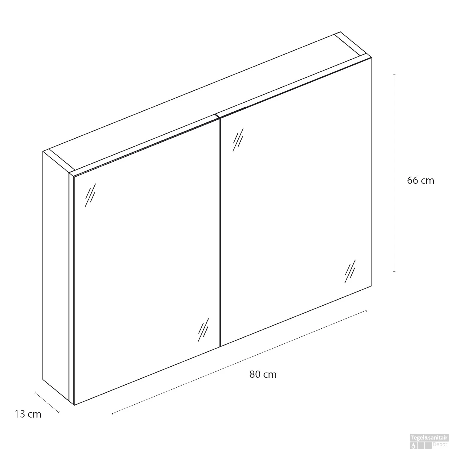 De spiegelkast is voorzien van twee deuren met daarachter twee verstelbare plankjes. Hierdoor kunt u met gemak uw veel gebruikte toiletartikelen kwijt, zoals een deodorant, parfum of een haarborstel. De spiegel heeft een breedte van 80 cm, een diepte van 13 cm en een hoogte van 66 cm.