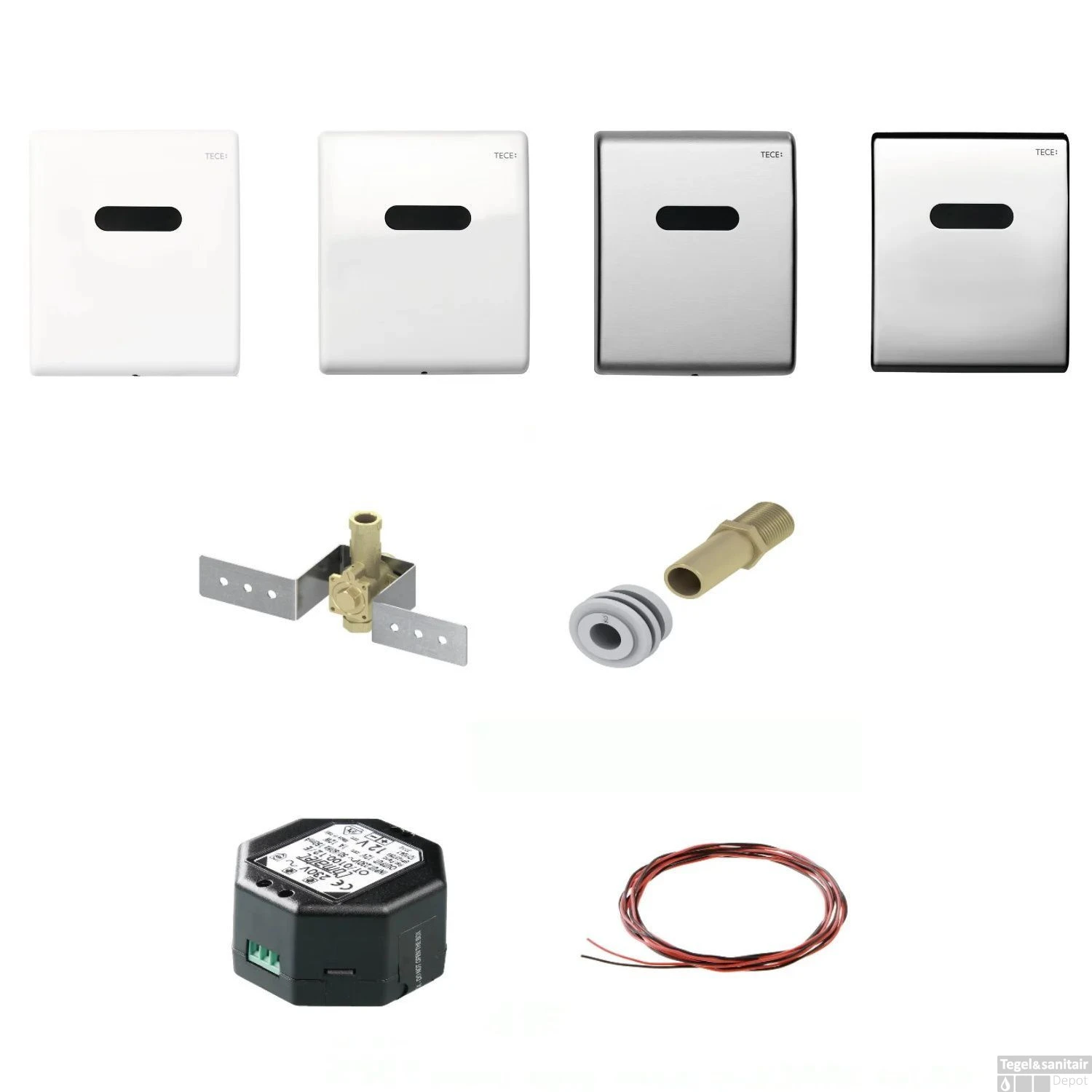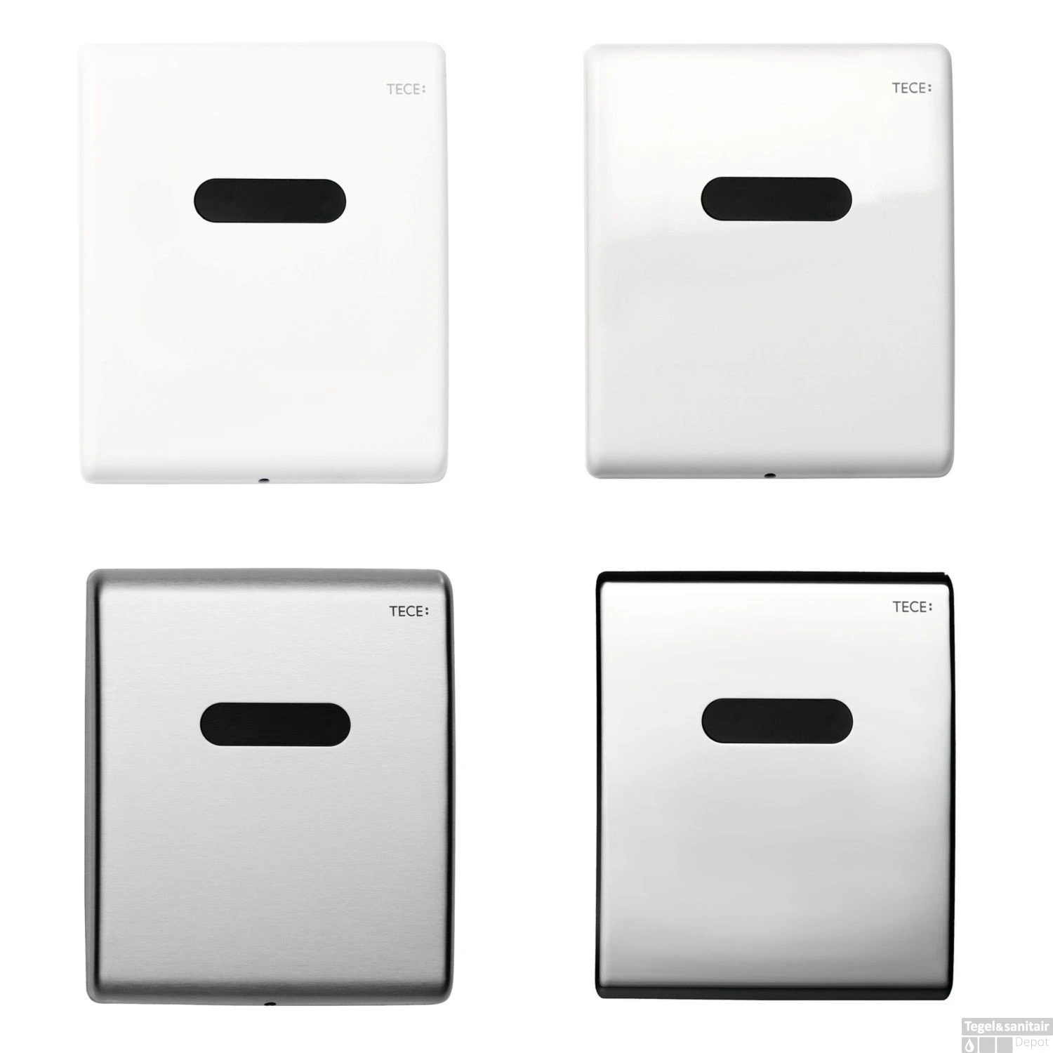 Naast de standaard drukspoelerbehuizing, inlaatgarnituur en het sifon heeft u bij deze urinoir set ook de keuze uit vier verschillende elektronische drukplaten van het merk TECE. Deze drukplaten zijn voorzien van een infraroodsensor en werkt op basis van een adaptor. De drukplaat heeft een breedte van 10 cm, een hoogte van 12 cm en een diepte van 1,2 cm. U heeft bij de drukplaten de keuze uit een mat witte, glanzend witte, RVS geborstelde of glanzend chromen drukplaat.