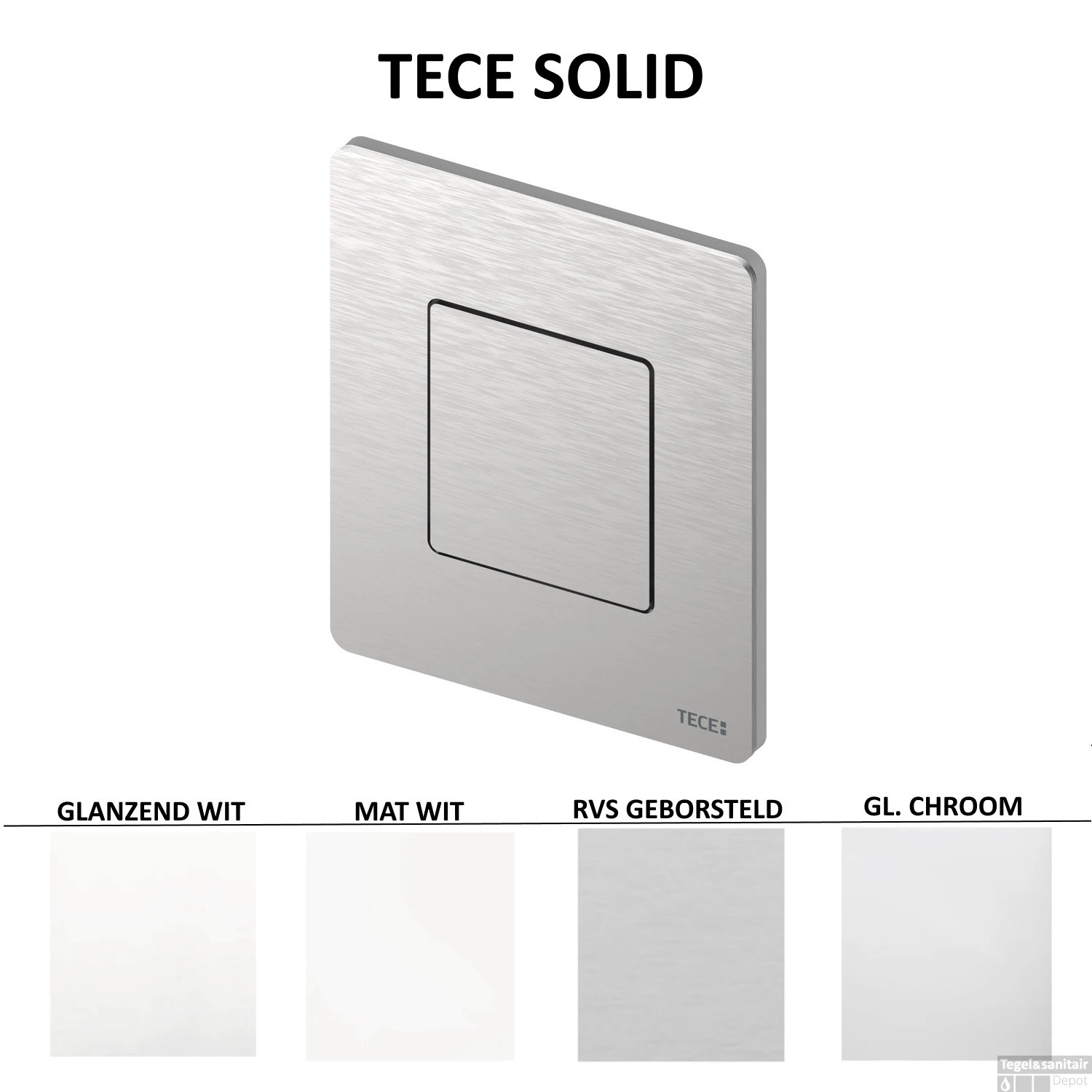 Naast de standaard drukspoelerbehuizing, inlaatgarnituur en het sifon heeft u bij deze urinoir set ook de keuze uit vijf verschillende ‘Solid’ drukplaten van het merk TECE. Deze drukplaten worden geleverd met een cartouche voor de drukspoeler en hebben een breedte van 10,4 cm, een hoogte van 12,4 cm en een diepte van 6 mm. U heeft bij de drukplaten de keuze uit de kleuren glanzend wit, mat wit, RVS geborsteld en glanzend chroom. Voor een meerprijs van €20,00 kunt u bovendien een RVS geborstelde drukplaat aanschaffen die is voorzien van een beschermlaag tegen vingerafdrukken.