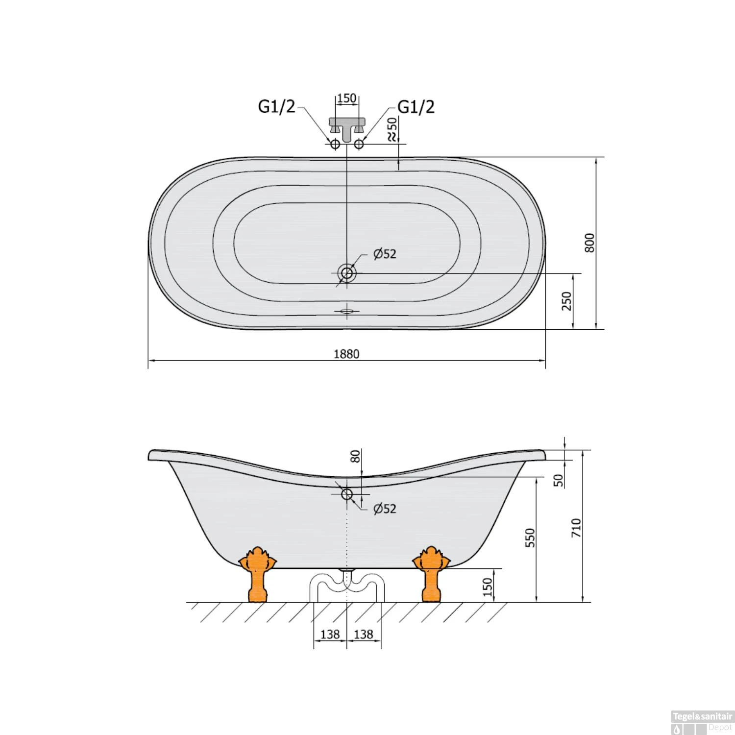 Specificaties Vrijstaand Bad 188x80x71 cm Wit met Leeuwenpoten Sapho Charleston: