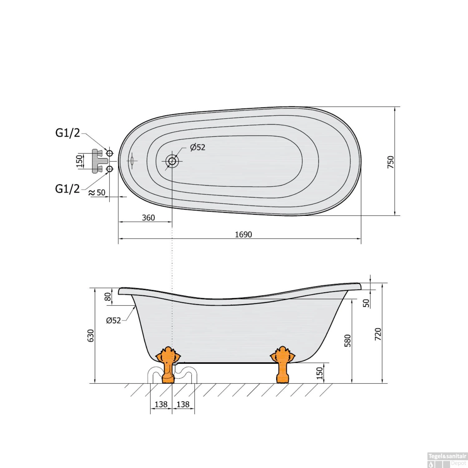 Specificaties Vrijstaand Bad 169x75x72 cm Wit met Leeuwenpoten Sapho Retro: