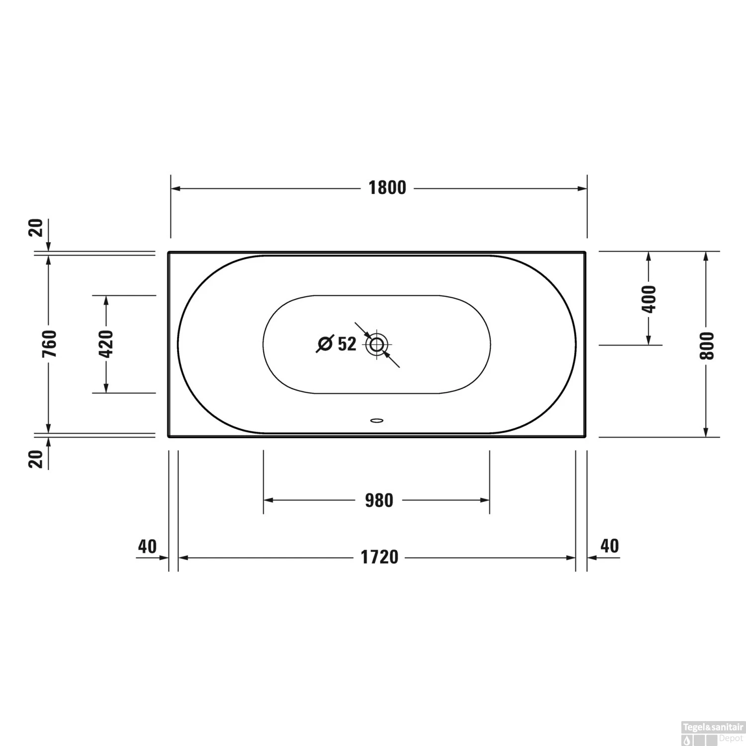 Het bad is voorzien van een overloop en afvoergat in het midden van het bad met een diameter van 52 mm.